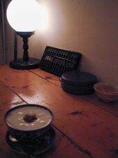 灯りの手前になるのは古いそろばんで、下に5玉あるばかりでなく上には2玉あるのです。