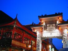 長安門から南京町へ入ります。これは帰りに撮ったものだけど、空の色が嘘のように青い夕暮れでした。白い門、赤い建物とのコントラストがぞくぞくしました。色調補正一切なしですよ。