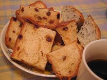 朝ごはんの残りのシナモンレーズンパンなど。コーヒーを挽いて、きちんと淹れて貰い、つまみました。