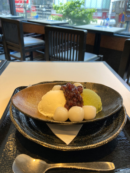 夫は、15年前と同様に宇治金時にしていました。私は白玉小町820円。バニラと抹茶のアイスに、粒あんがかかって、もちもち白玉が添えらえています。推察するに、バニラは以前小豆アイスだったような感じですが、あんこがかかっているのでバニラで全然問題ありません。程よく冷たく甘く、クールダウンができました。