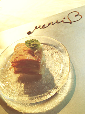 上から、ミルフィーユ、カヌレと焼き菓子、シャーベット、カスタードプリン。