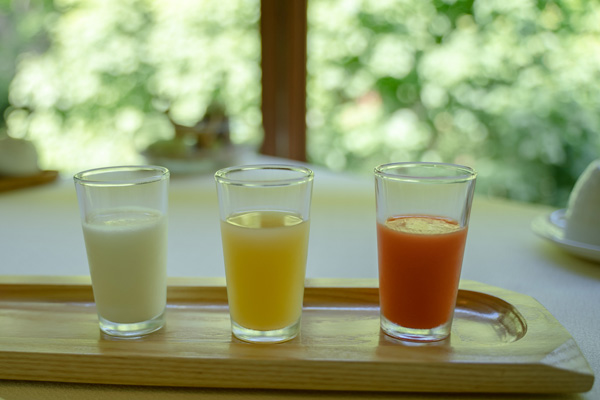 右が近所で採れた人参のジュース、真ん中が長野県産リンゴジュース、左が確か長野県産の牛乳だったと思うのですが、レモンと蜂蜜が加えられたちょっとしたヨーグルトドリンクみたいな感じになっていました。これが二人分のディスプレイだとこんな感じになり、運ばれた瞬間「おおー!」となりました。