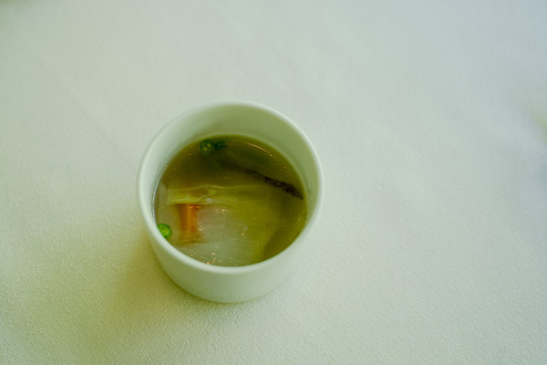 次に運ばれた温かいスープは、昆布ベースだったのでこれまた胃にやさしい感じ。野菜もごろっとたくさん入っています。