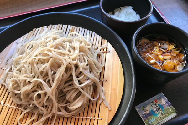 前日のページのコピペの消し忘れでは…と思われるほどデジャブ感満載ですが、検討に検討を重ねた結果、やっぱりここでもう一回お昼にしようということになりました。値段と美味しさのバランスがよいのです。冒頭は夫の葉わさび漬けと玉ねぎ天のトッピングのざるそば。私はざるにおろしというシンプルな構成。