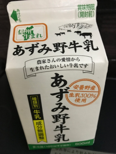 あずみ野牛乳はバス内のドリンクとして。今朝は牛乳っぽく牛乳を飲めなかったから、牛乳としての牛乳を飲みたかったという夫が購入。私も少し飲んでみましたが美味しい。コーヒーに入れたい。