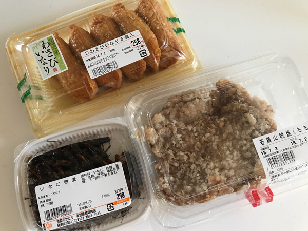 後は、夕食に軽く食べるためのわさびいなりとなんだかんだ気に入っている山賊焼き。