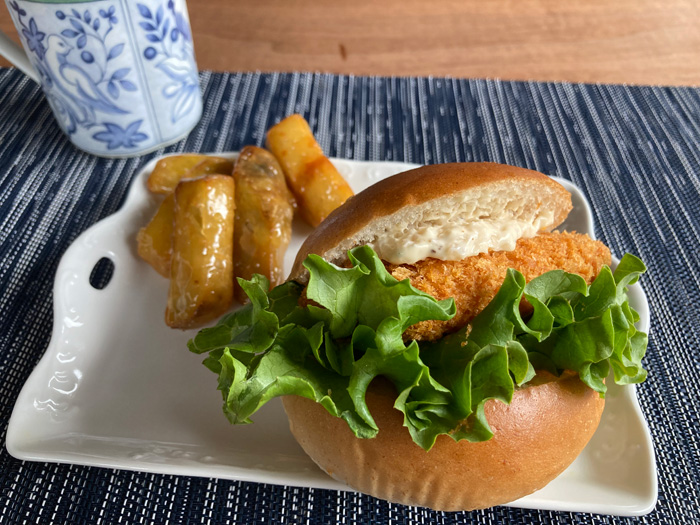 一見、ハンバーガーとポテトの組み合わせのようでもありますが、どれもちょっと違う感じに。午前中にオーケーストアに買い物に行き、自分のお昼ご飯も購入しました。なんとなく鮭フライバーガーが目に留まりまして。