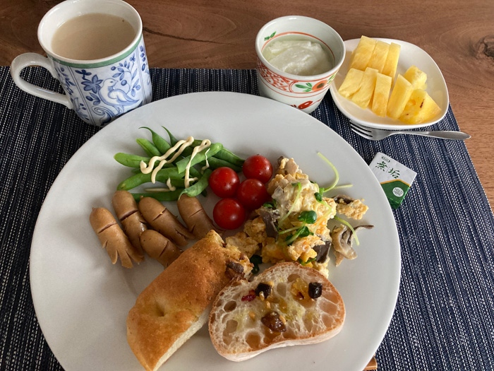 パンは、どこのパンだろう。ちょっと記憶があやふやになってきて不明なのですが、ここでもドライフルーツとナッツのオリーブオイル漬けを。チーズも一緒に乗せたりして、色々楽しんでいます。