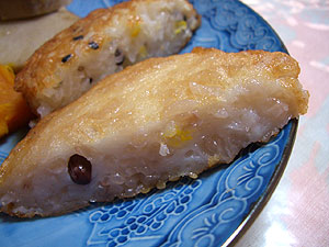 これは、手前が赤飯の天ぷら、奥がおにぎりの天ぷら。