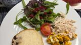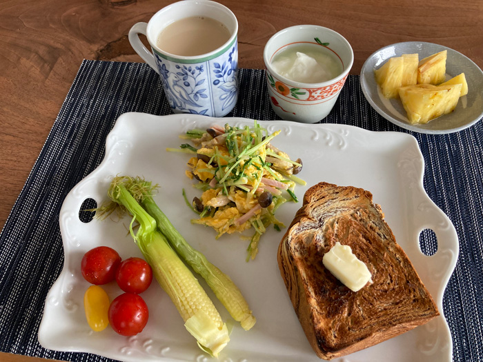 トーストはチョコレートパン。バターは冷凍していたので溶けるのに少し時間が掛かりました。