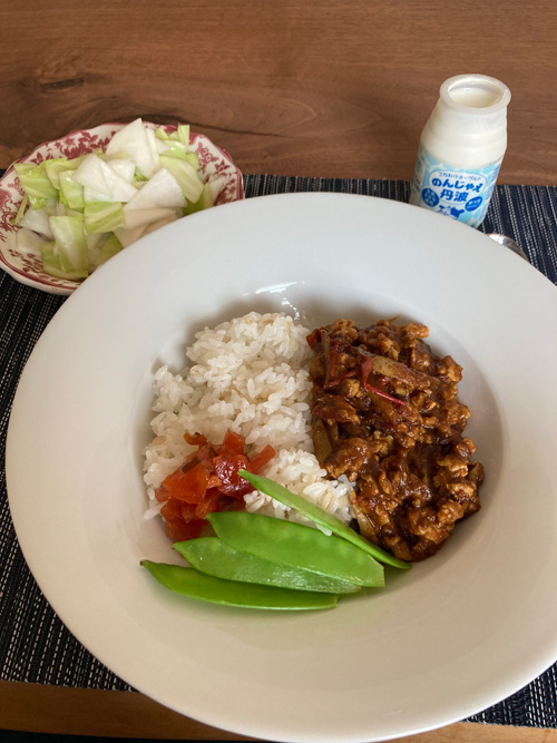 以前買って残っていたドライカレー用のルーを使ってお昼ご飯。鶏ひき肉と、かなり熟した大玉トマトで作りました。一期一会の感じのドライカレーになりました。
