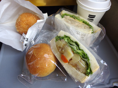 夫のツナサンド280円と味付き卵190円、私の肉じゃがサンド280円とあんずショコラ160円。