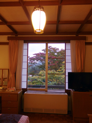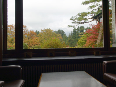 窓の外には紅葉した木々が見えます。