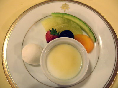 本日のデザートは、果物とゆずシャーベットと、杏仁豆腐の生姜ソースかけ。