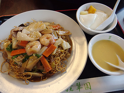 五目あんかけやきそばと、スープ、杏仁豆腐がついています。