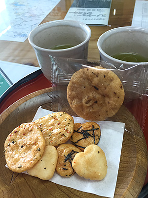 購入しますと、こうしてお煎餅の盛り合わせとお茶をサービスしてくださいます。