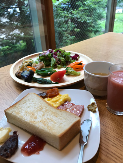 全体的にごはんでまとめた方がよさそうですが、ステーキを焼いていた鉄板でトーストがどんどん出来上がってくるのでつい1/2枚いただいてしまいました。気持ち、この半分の厚さでもう少しこんがりだと嬉しいな。あんこまも添えます。その横の鉄板ではベーコンを焼いているのでこちらも一切れいただき。ラタトゥイユも添えて。トマトジュースはこちらの売りのようで、宮城県産のフレッシュなトマトを使って出来立てのジュースでさっぱりしていました。飲みやすいです。おかずの数々もいずれもいい。全てを食べきれない。これも選抜メンバーです。