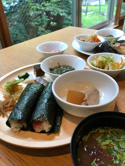 さて個人的に本命の手巻きおにぎり。山形県産つや姫のごはんに好きな具を選んで、スタッフの方に巻いてもらうのです。