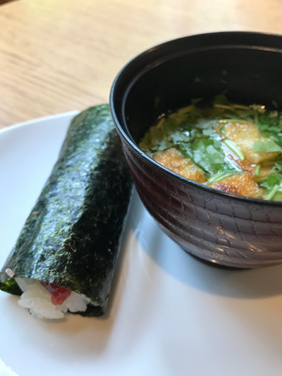 筋子と、仙臺みそに付けた牛タンが殊の外おいしくて。もちろんお味噌汁は仙臺みそを使用し、具は自分で好きなように組み合わせられます。なので、なめこや三つ葉、ふのりで構成。