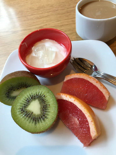 フルーツとカフェオレと、岩泉ヨーグルトに杏仁豆腐とナタデココを組み合わせたデザートで締めくくり。