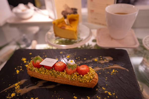 予約していなかったので、次のお客様が来るまでの30分以内でという条件付きでした。ギリギリセーフ。人気店なので予約が安心ですね。サロンのカウンターの世界観からしてもう素敵。すでにケーキを選ぶ時からワクワクは始まっていまして。私はイチゴとピスタチオのエクレール。中にはたっぷりのピスタチオのクリームのエクレール ヴェリック400円とブレンドコーヒー350円。
