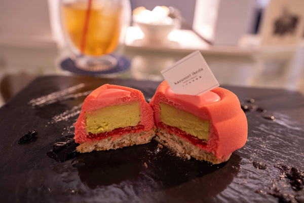 フランス産イチゴのクレーム、クレーム ブリュレ ピスターシュ、サブレ ノワゼットの三位一体なのがより分かるのが、カットしたとき。