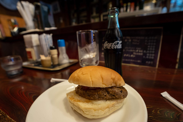 ハンバーガー発祥のお店ということでいつか行っていたいと思っていたので嬉しい。牛肉を100%使った、シンプルなハンバーガーです。私はほそやのハンバーガー350円をコーク300円とともに。