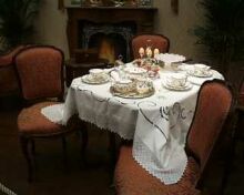 トップクロスとアンダークロスの1色、椅子のシートの色が一緒で、テーブルの上の鍵付きティーキャディ、椅子、後ろのカップボードが素材感もあってて、シンプルで落ち着いた雰囲気です。