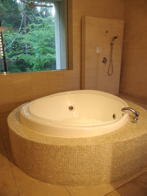 上階まるごとバスルームで、しかも丸いジェットバス付きの湯船が真ん中に鎮座ましているではないですか。