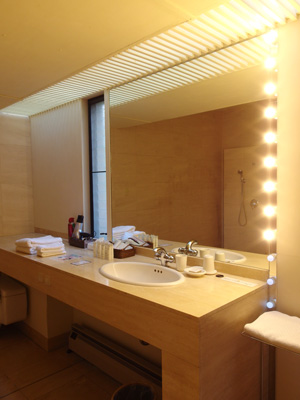 洗面台は、天窓からの灯りで気持ちいいのですが、女優ライトっぽいのも付いていて雰囲気を増してくれます。