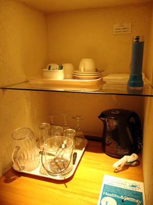 ベッドルームにはミニバー。グラスやカップが何故全て3人分がなのかが微妙に不思議でした。