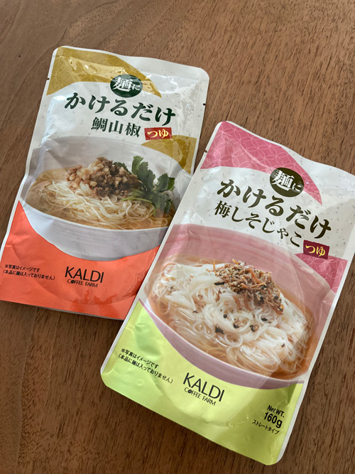カルディで私用に買った2種類の「麺にかけるだけ」つゆシリーズ。