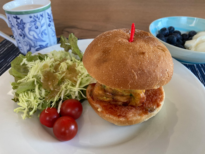 青ねぎとかツナとかで卵焼き器で作ったので、全然バンズのサイズとは違うので、なんだか収まりがよくない仕上がりに。でもまあむぎゅっと食べれば味的には問題なし。