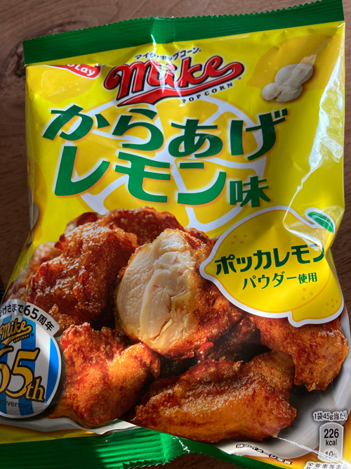 夫のツマミのマイクポップコーンは、からあげレモン味。