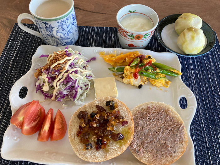 グリーンアスパラとしめじをソテーして、コンソメ顆粒を入れた卵で閉じて、黒胡椒やケチャップをかけた洋風で。今日は午後休を取得しているので、午前中の仕事も軽やかな気持ちでした。