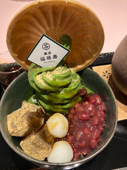 もつとか鶏肉とか勿論パクチーとか。鰹出汁のとろみのあるスープが染み渡ります。辛いタレを溶かすと結構辛くなりましたが、私が食べられないほどでもなくちょうどいいと感じました。そしてそうめんみたいな麵と認識していましたが、実際の麺を茹でるところを見るとそもそも茶色の乾麺で違うかなと。麺線をもっと気軽に食べられるといいな。スープも全部飲み干して、何という満足感。お昼ご飯はこれでおしまいにして階下に移動し、夫が前から行きたがっていたこちらの甘味処へ。