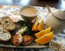 Yuyuさんのソーセージ、ブロッコリー、ゴマフランスパン、オレンジ、ミルクティ(アッサム)