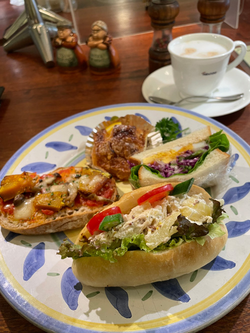 そして今回の気まぐれサンドは、鶏ささみ、馬鈴薯、粒マスタード入りサラダサンド、カボチャとキノコのタルティーヌ、ツナとゆで卵・紫キャベツの極サンド、そしておやつパンは定番のにクリームがサンドされていました。