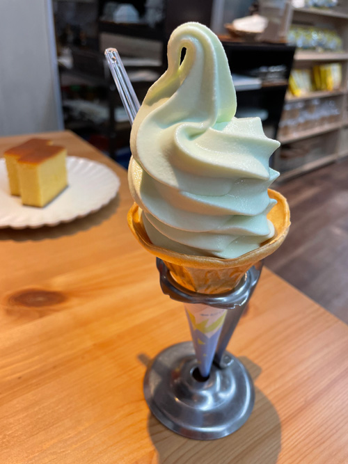 たくさん歩いて中のテーブルに落ち着いてメニューを見て、かぼすソフトクリーム440円に即決です。かぼすのソフトクリームって今までに食べたことがないですし、かぼすの爽やかさを求めたい気持ちにぴったりです。佐賀県太良町の「風の牧場」の牛乳を使用しているのだそう。大変美味しくすっきりとリフレッシュできました。