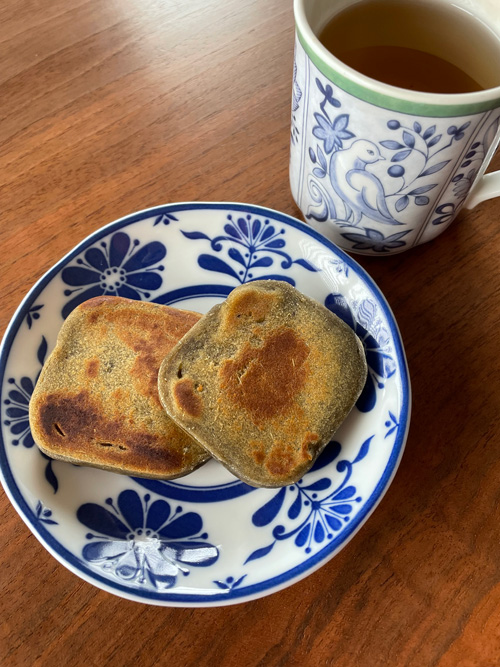 今回購入したのはよもぎ入りでこんな風に小さな食べきりサイズ。これを2枚にスライスして焼きました。