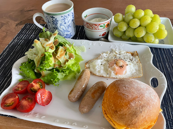 パンは先日焼いた野菜ジュースのパンの最後の。何かサンドしようと思ったのですが、昨日購入した生ソーセージを食べることを優先したので挟めず。でも久しぶりの生ソーセージはぷりっとして美味しかったです。