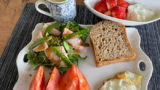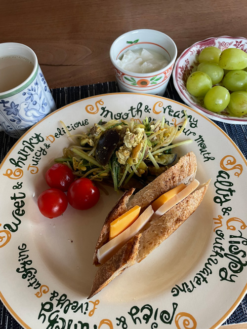 バゲットにチェダーチーズとハムをサンドした簡単なサンドウィッチ。後は水菜の卵とじとミニトマト、ミルクティ、自家製スキムミルクヨーグルト、シャインマスカット。いつもの感じの朝食です。
