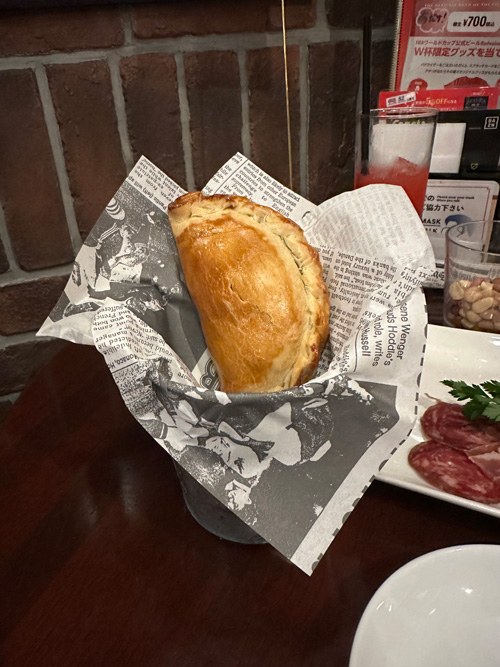 遅い時間であまりちゃんとした食事は不要な時にパブは最適と改めて思いました。店の雰囲気はイギリスっぽい。ブラッドオレンジジュースとオリジナルパスティ。コーンウォールで食べたコーニッシュパスティを思い出します。フィッシュ&チップスもシェアしつつ。夫はいろんなビールを各種ツマミとともに。