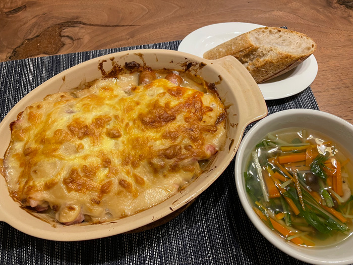 グラタン皿は大きいのでここから半分こにします。あつあつとろとろ。ハインツのソースだから何もしなくてそのまま美味しい。バゲットに付けたりしながら、あつあつの晩御飯でした。