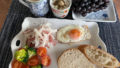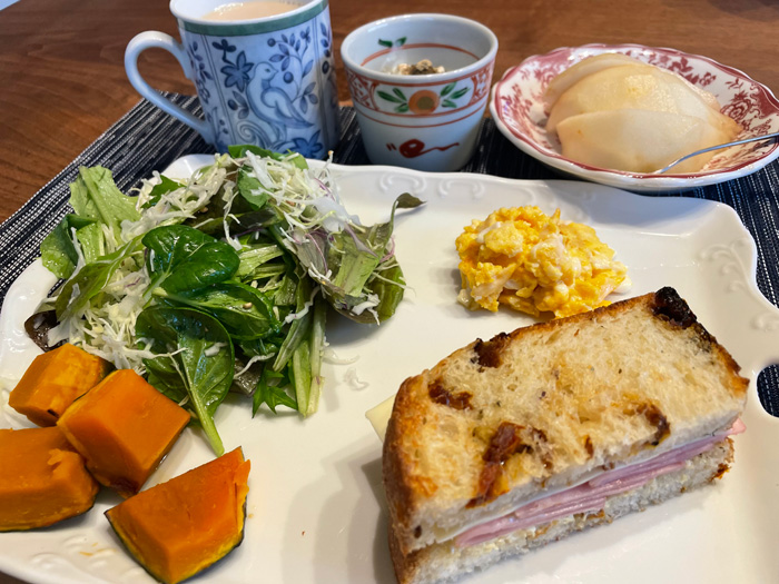 ベビーリーフもそろそろ朝には寒く感じる頃かな。なので熱々のレンチンかぼちゃでバランスを取りつつ、お皿も冷たいのでスクランブルエッグともども冷めていくのが早いです。そして写真を見て振り返ると電気を付けているのがわかるので、お天気が悪かったのかなあと思ったりします。