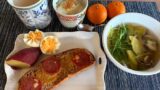 オムレツと言っても所謂オムレツの形には一切することもなく、卵焼き器で二人分分厚く焼いて、お箸で半分に切るというずぼらさ。ベビーリーフも別容器で薄くドレッシングを纏わせています。ミニトマトがあるとやっぱり嬉しい。パンは黒ゴマきな粉のパン。後程トーストしております。