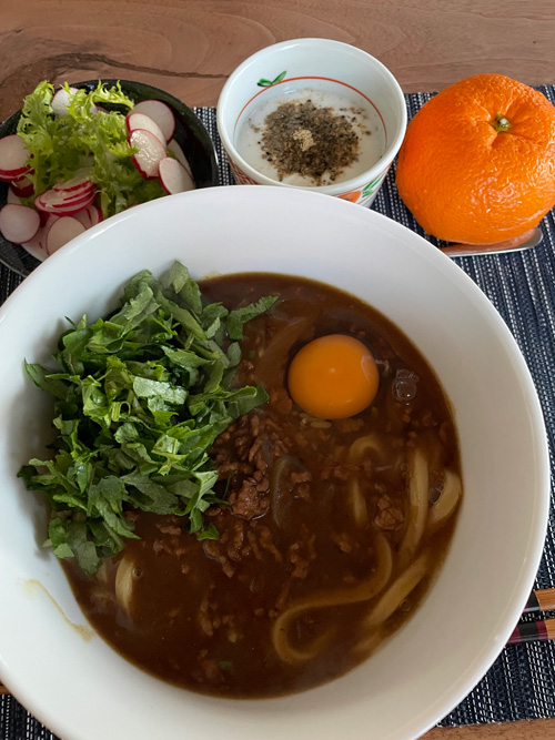 私にしては珍しく生卵を落としてみましたが、熱々のカレーうどんだったのですぐにかき混ぜてほんのり火が通りました。