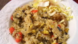 まずは野菜など。カリフラワー・ブロッコリー・トマトのサラダ、ハムエッグのむりやりな感じのしめじトッピングを経て。