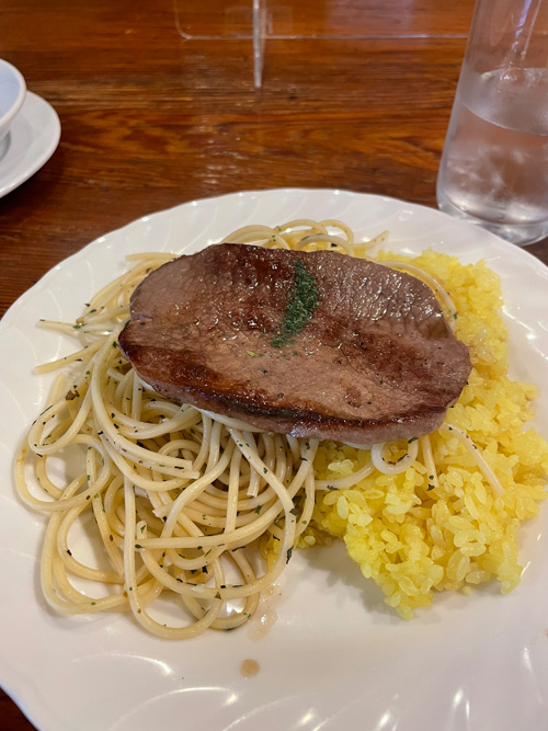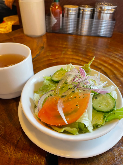 そこで2番目に食べたかった牛肉の薄切りステーキ1,000円をハーフセットでオーダーしました。量を半分にして、サラダとデザートが付くタイプを選択。