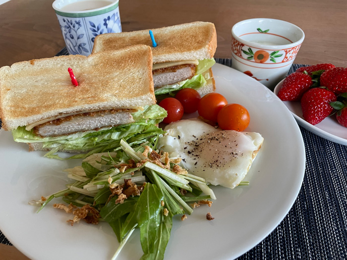 夫が昨夜ジム帰りにスーパーで購入してきてくれたお惣菜を使ってのトーストサンド。揚げ物なのでレタスを多く一緒に挟むようにしました。スライスチーズと一緒に。